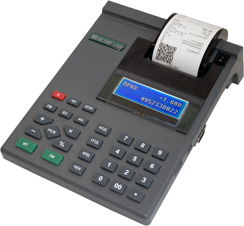 Универсальная ККМ "Меркурий-130Ф" предназначена для осуществления денежных расчетов с населением в сфере торговли и в сфере услуг. Выполняет кассовые операции учёта и контроля, печати чека, контрольной ленты (электронного журнала покупок), отчётных документов. Имеется вариант исполнения ККМ с двухленточным термопечатающим механизмом для одновременной печати на чековой и контрольной лентах- "Меркурий-130Ф2".